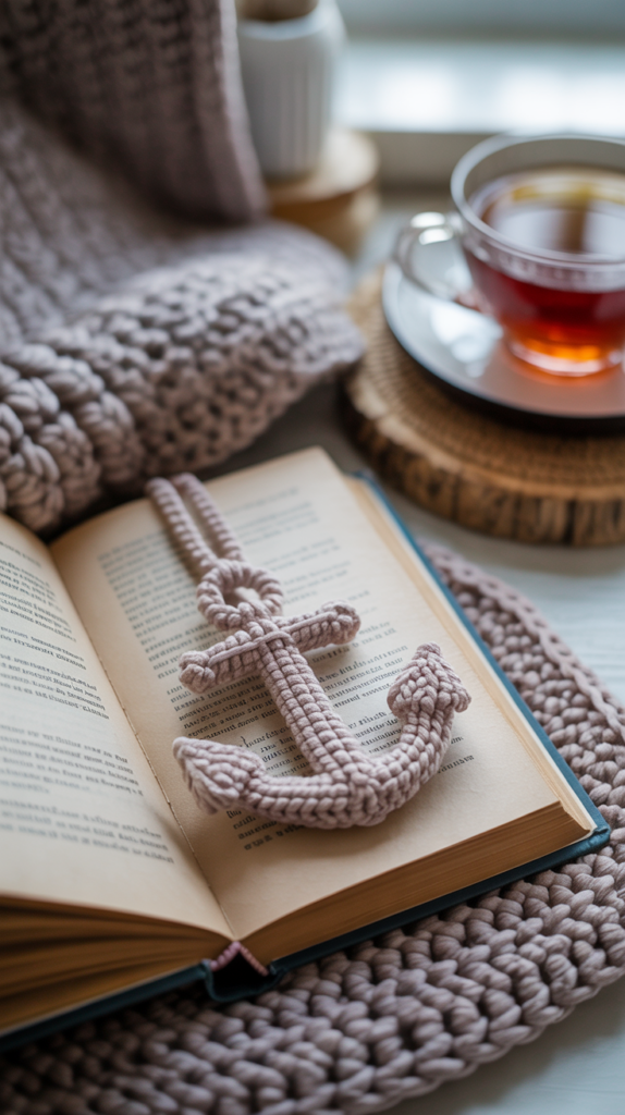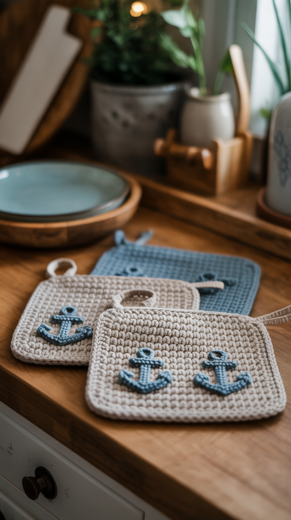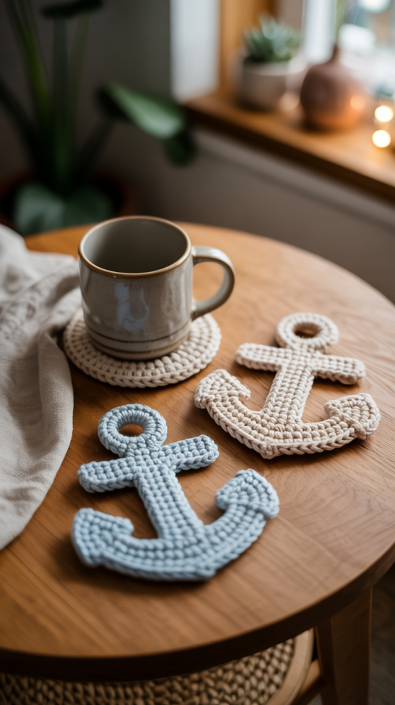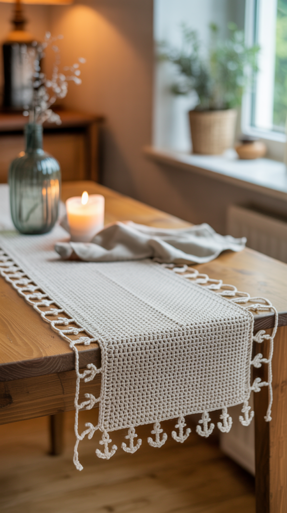 Ein Tischläufer mit gehäkeltem Ankerrand verbindet Funktion und Stil. Du arbeitest zuerst das Grundgewebe und fügst dann eine Reihe kleiner Anker als Abschluss hinzu. Der Läufer passt gut auf schmale Tische oder Fensterbänke.