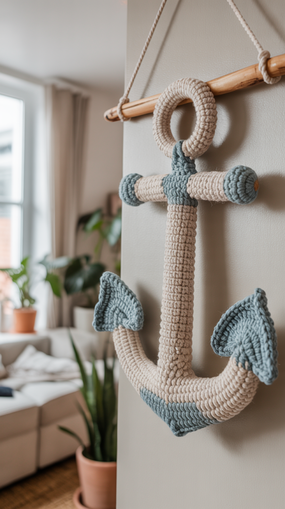 Ein Wandbehang mit gehäkeltem Anker schafft maritimes Flair im Flur oder im Wohnzimmer. Die etwas größere Ausführung erlaubt Spielraum für Farbe und Muster. Du kannst das Motiv zentral platzieren oder mehrere Anker nebeneinander hängen.
