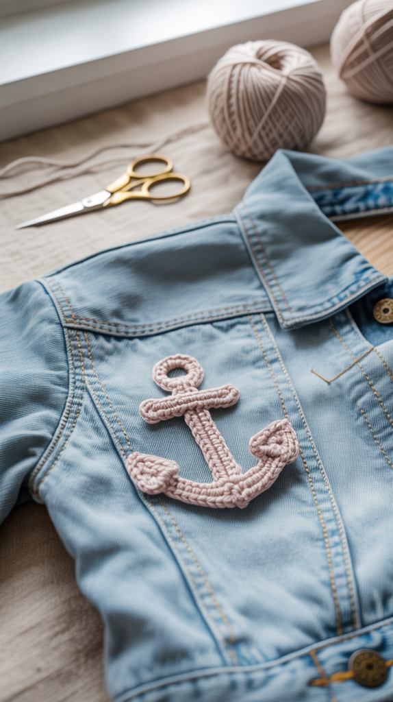 - Nähe die gehäkelte Ankerapplikation auf die Vorderseite