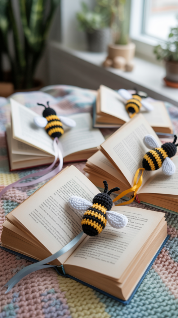 Ein Buchzeichen in Bienenform setzt einen persönlichen Akzent zwischen den Seiten. Die schmale Form gleitet leicht und markiert die Stelle zuverlässig. Dabei gewinnst du Erfahrung im Häkeln flacher Elemente und im Anbringen von Bändern.
