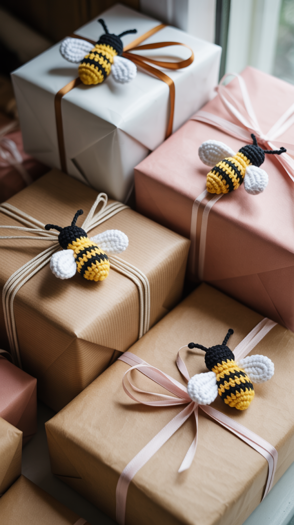 - Binde die Biene an das Geschenk und passe die Schlaufe an.