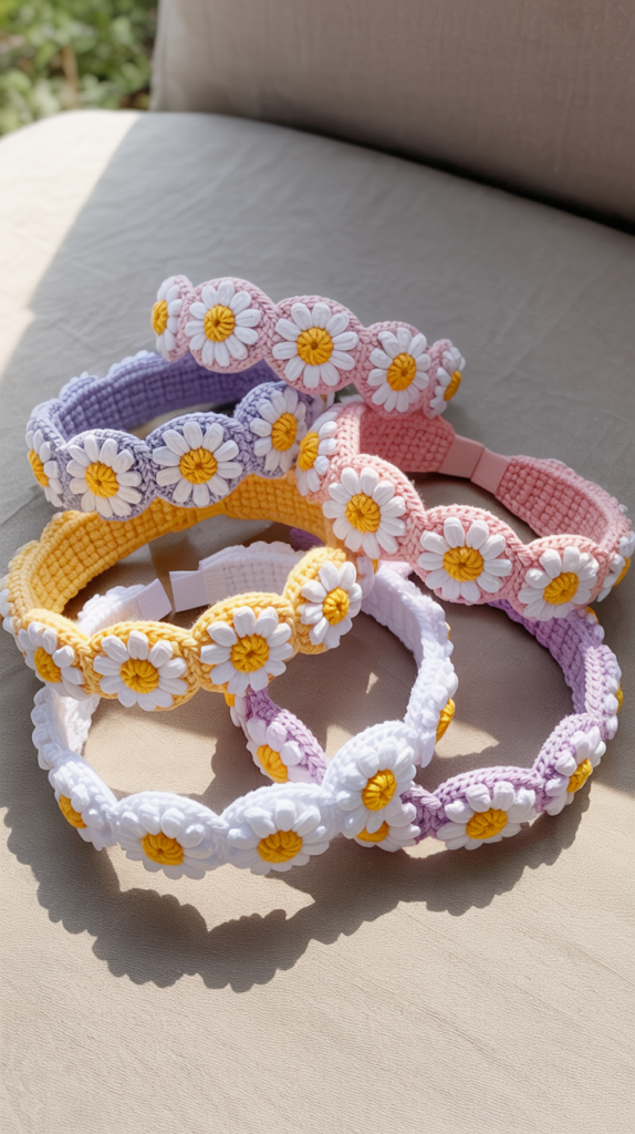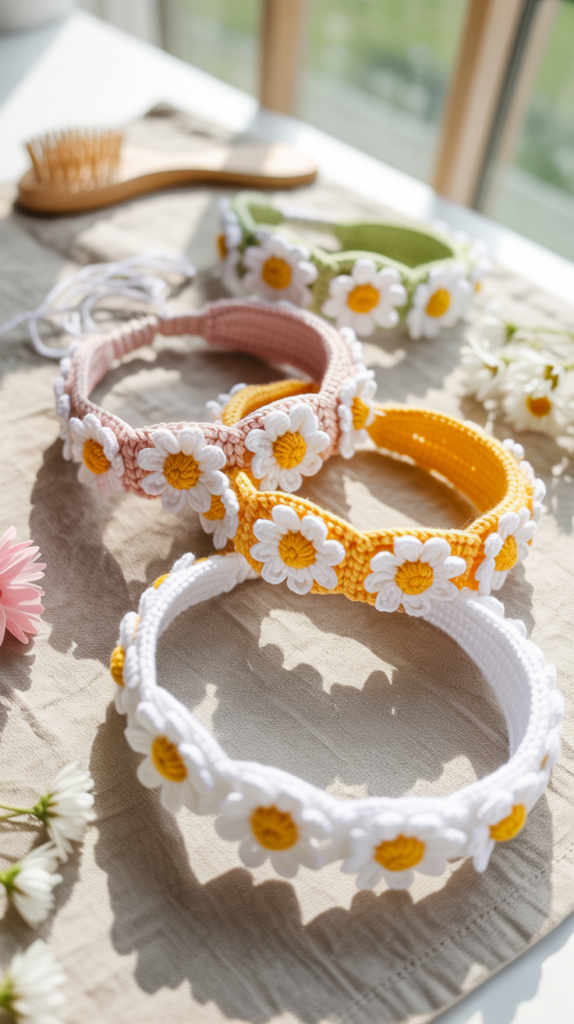 Ein gehäkeltes Haarband mit Daisys setzt zarte Akzente im Alltag und im Sommer. Es sitzt bequem und lässt sich individuell an Kopfgröße anpassen. Besonders praktisch sind die festen Maschen im Abschluss.