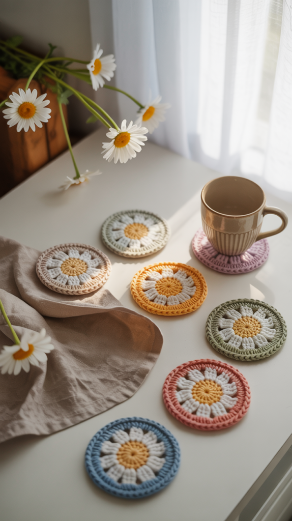Untersetzer mit Daisys schützen deinen Tisch vor Flecken und setzen florale Akzente. Sie sind schnell gearbeitet und lassen sich in mehreren Farben kombinieren.