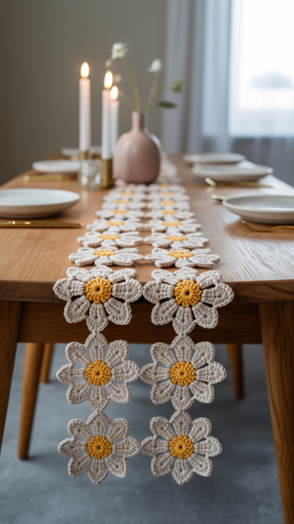 Ein Tischläufer aus Daisys wirkt leicht und freundlich. Er eignet sich für den Esstisch, das Sideboard oder das Fensterbrett. Die Verbindungsweise der Blumen entscheidet über die Stabilität.
