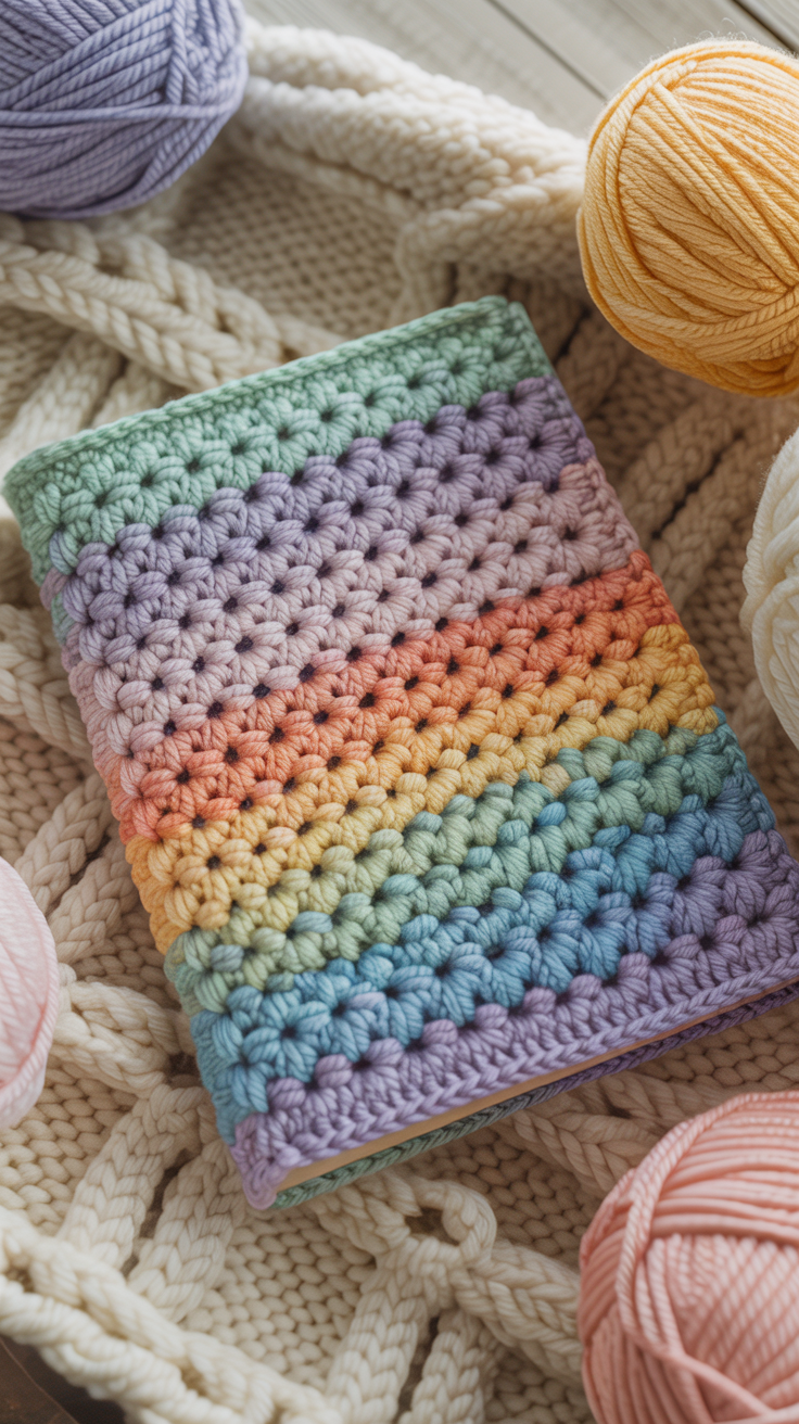 A cover in rainbow stripes looks colorful and optimistic. You crochet narrow strips of different colors. This pattern is suitable for diaries or children’s books and brings a good mood to everyday life.