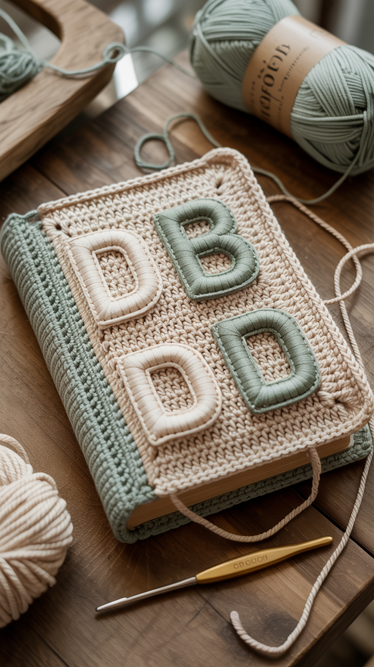 A cover with a name application is personal and individual. The personal touch makes your book unmistakable. You crochet letters in appropriate font and sew them on. This design is suitable as a gift or for your own journal.
