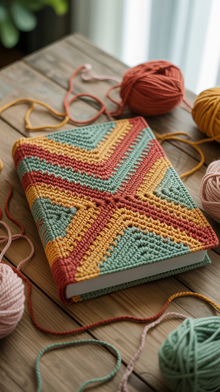 A geometric design cover sets the scene for clear lines and shapes. Combine single crochet stitches and chopsticks in regular patterns. Simple color changes result in rhombuses or triangles. This cover is particularly suitable for non-fiction books and notebooks.