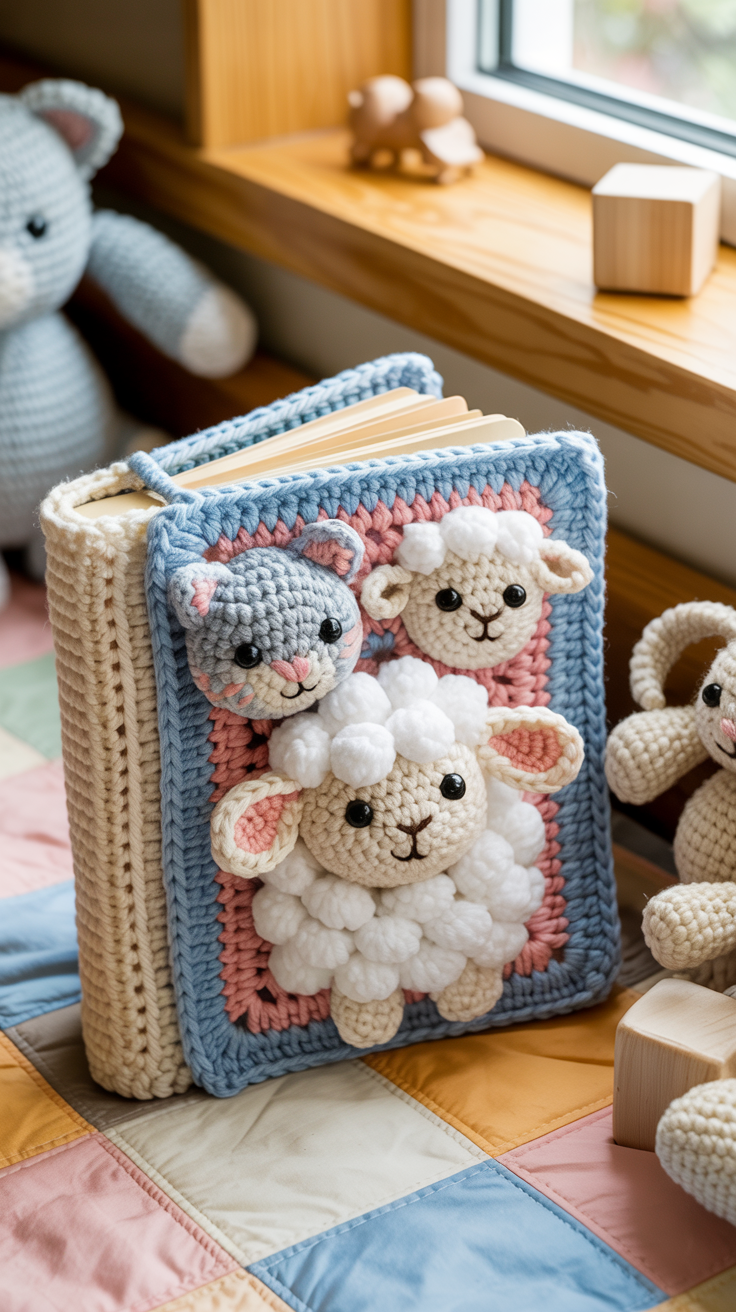 A cover with animal applications is fun and looks playful. You crochet small animals and sew them onto the case. This design is perfect for children’s books and notebooks.