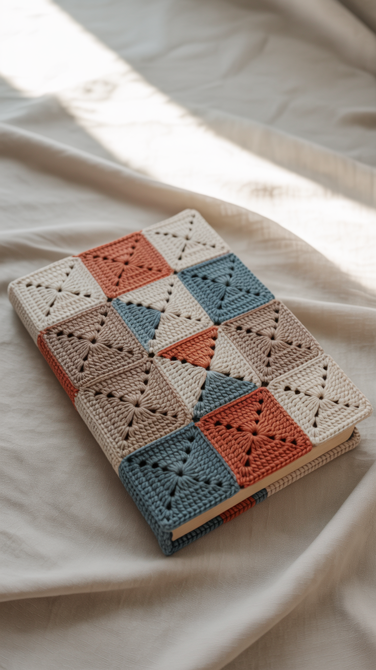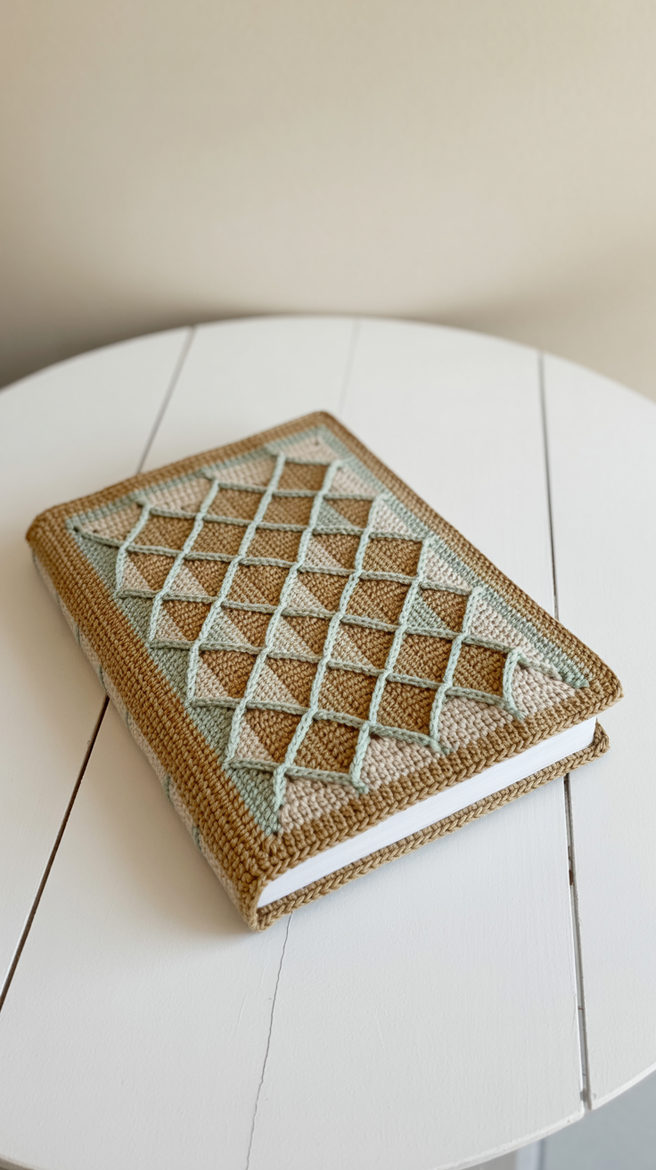 A rough motif cover looks modern and graphic. The regular pattern ensures a calm effect. You crochet small squares and put them together into diamonds. This design is suitable for non-fiction books and creative notebooks.