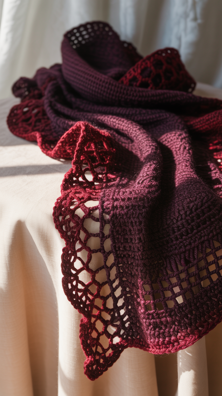 A narrow cloth that puts the vampire look underline around the neck. The tip edge is created by combining rods and chain stitches. Dark colors provide drama.