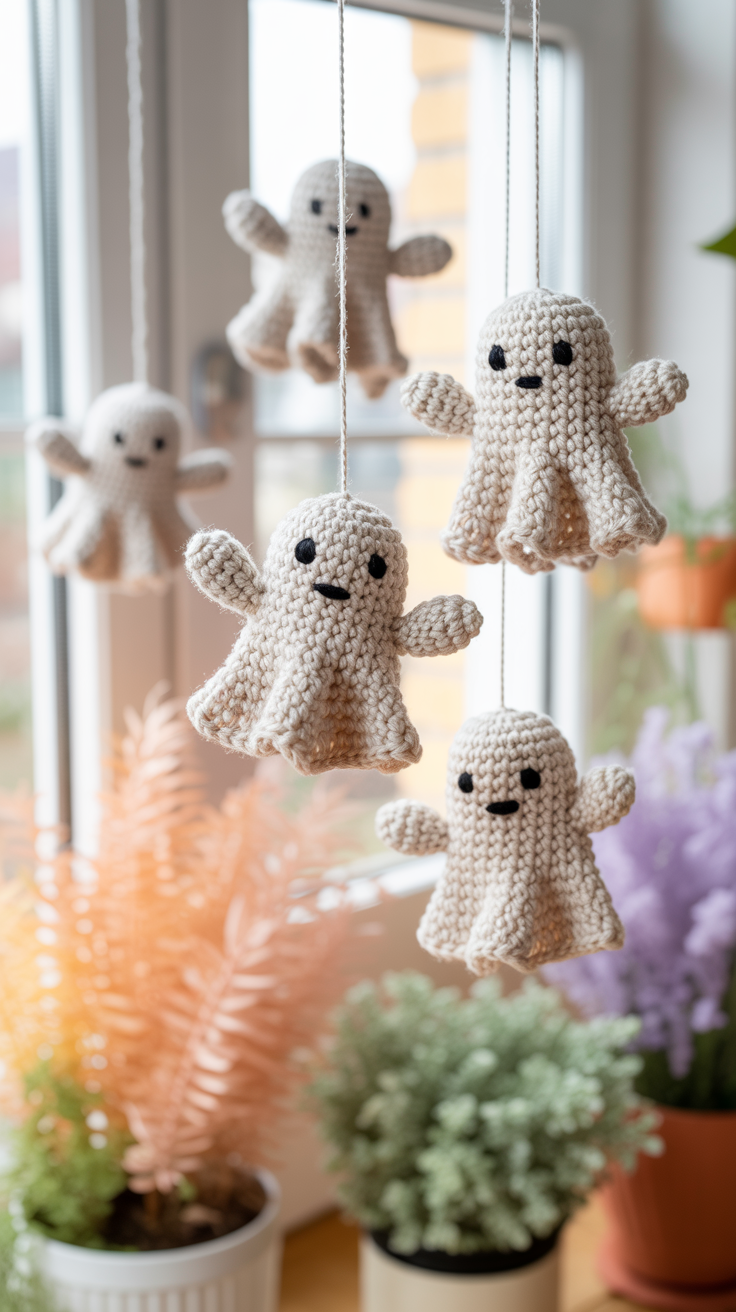 These ghosts fit on windows or keychains. They are crocheted quickly and can be produced in series. The white color brings brightness to the decor.