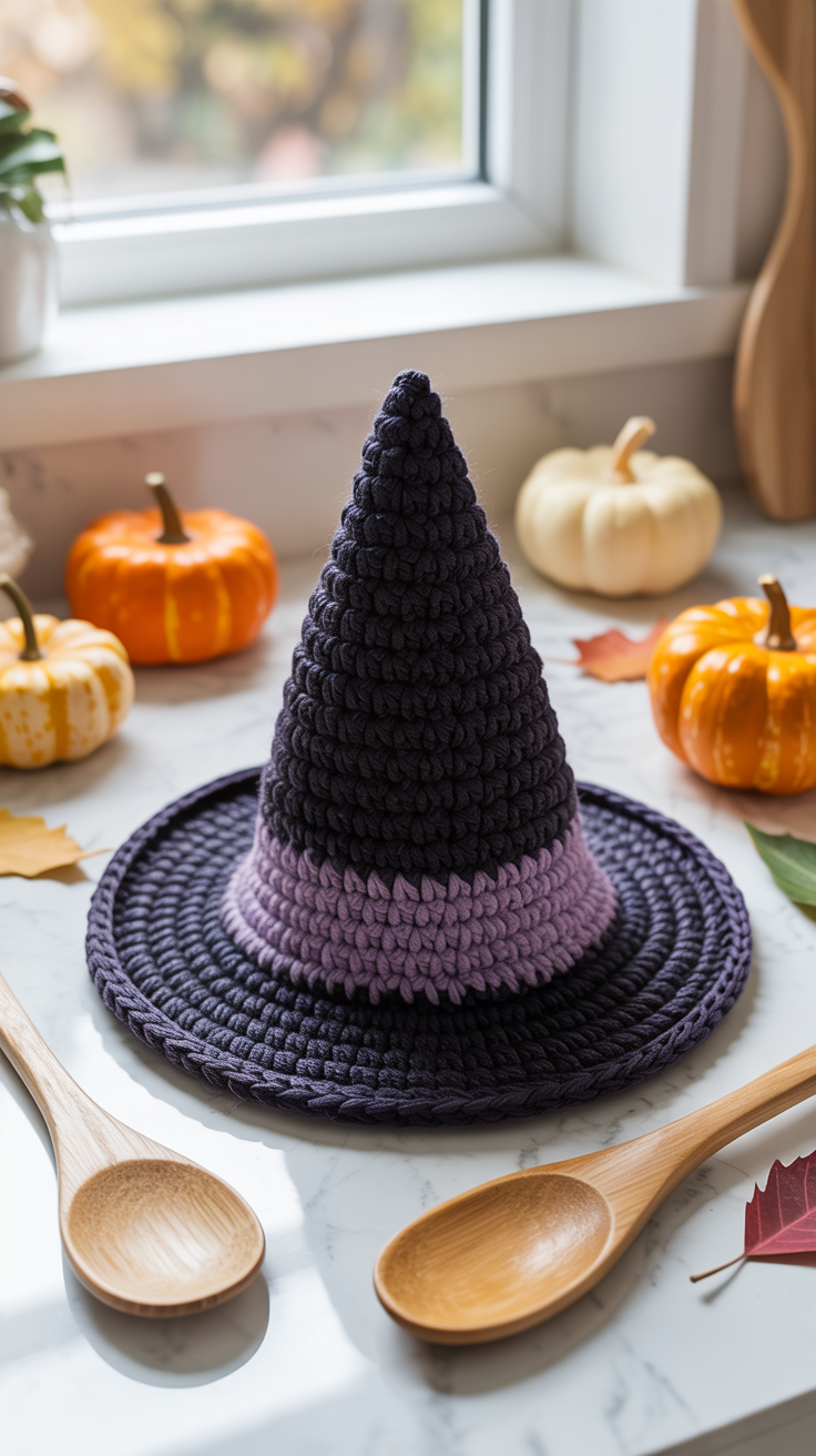 A useful potholder with Halloween flair. The tip forms the hat, the brim is created by larger stitches. Cotton yarn offers the necessary heat protection.