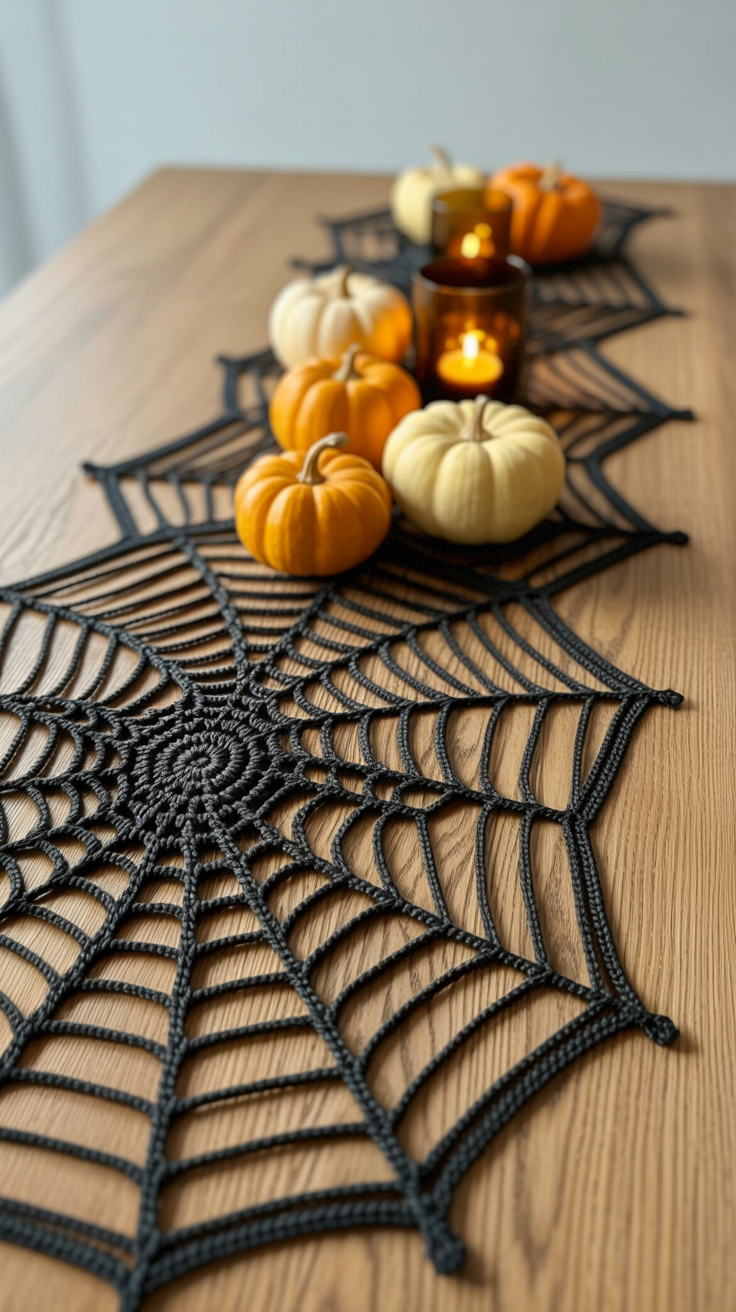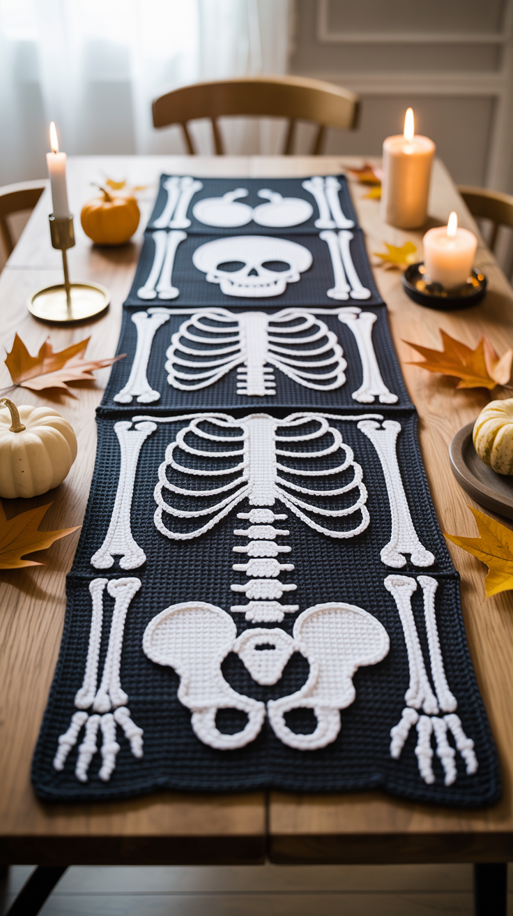 A longer runner with a skeleton pattern for the dining table. The pattern is created by combining solid stitches and hole patterns. The contrast between light and dark emphasizes the motif.