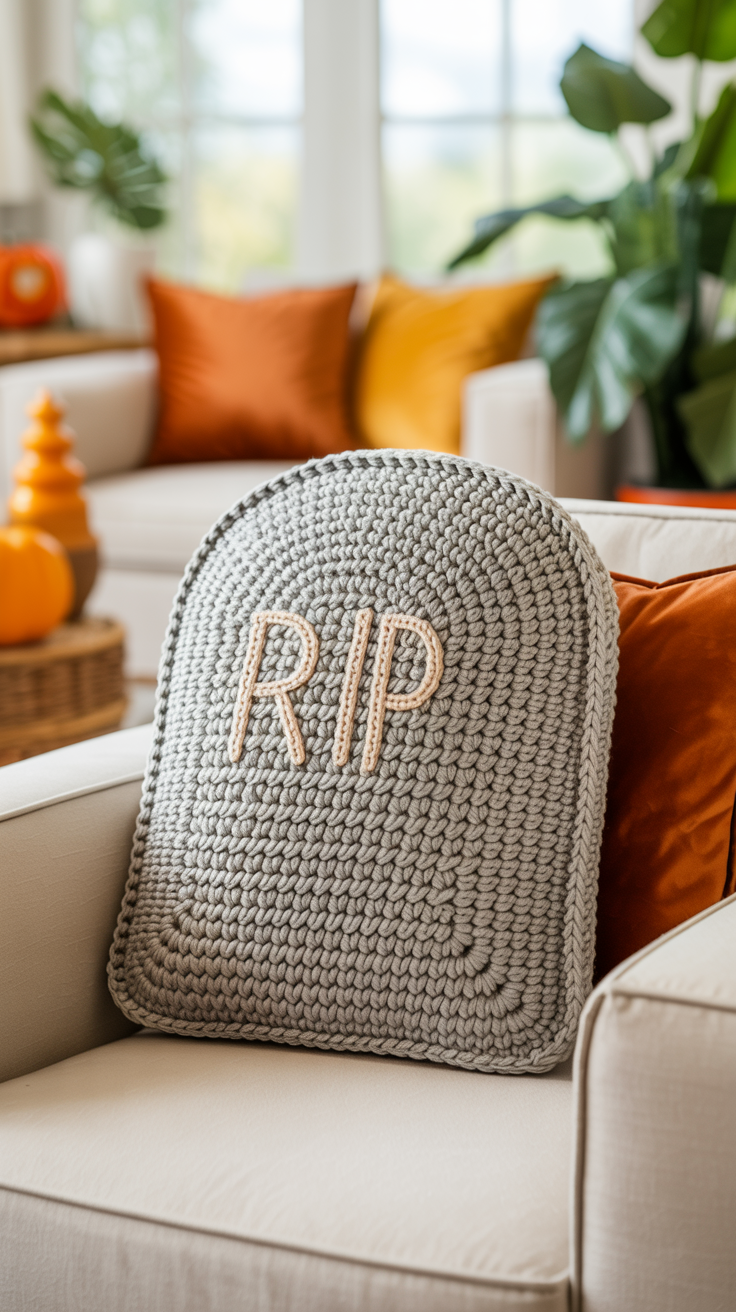 Just a lettering like R.I.P. Embroider with black yarn. For more depth you can use Gray Gradients. The pillow is suitable for indoors or as a throw pillow on the terrace.