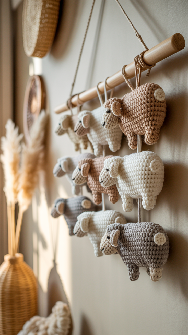 A wall hanging with sheep motifs blends in well with a living room or bedroom. The mixture of crochet and wooden stick matches the boho style. The result looks cozy.