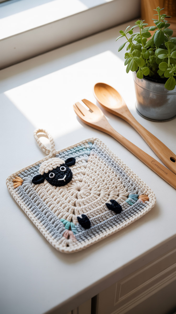 A pot holder with a sheep pattern protects against heat and ensures a good mood in the kitchen. It is practical and easy to hang up. The motif is subtle and looks modern.