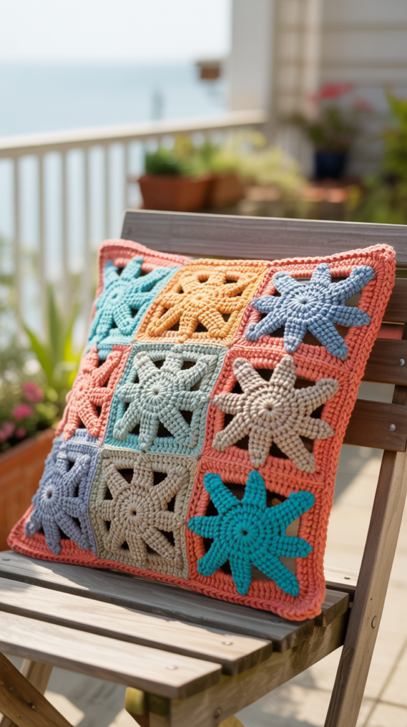 A seat cushion with integrated starfish looks cozy and maritime. It is useful for garden chairs or balcony benches. The design can be adjusted in any color scheme and is a good introduction to color changing.