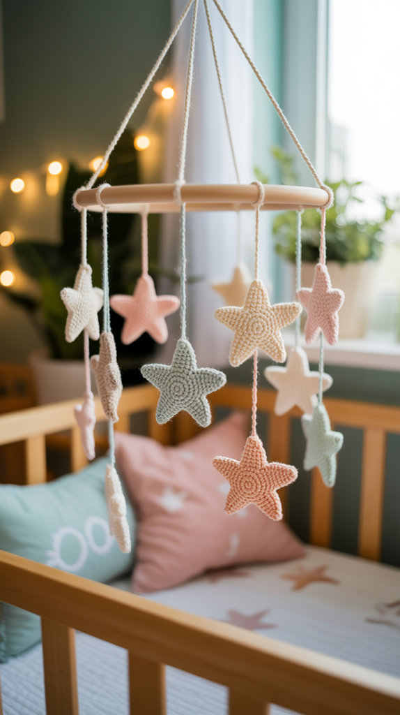 A mobile with sea stars creates a calm atmosphere and stimulates the imagination. The stars float above the bed and give the room a maritime touch. This project is well suited for small leftovers and is implemented quickly.