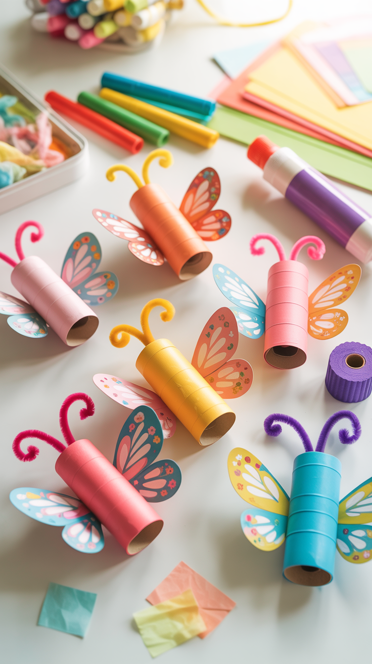 Aus einfachen Rollen werden fröhliche Frühlingsboten mit bunten Flügeln.
