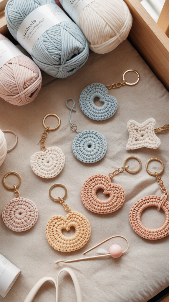 Du kannst verschiedene Formen häkeln, etwa Herz, Stern oder Kreis. Befestige am Abschluss den Schlüsselring mit einer Kettmasche. Kleine Perlen oder Bänder machen das Stück individueller.