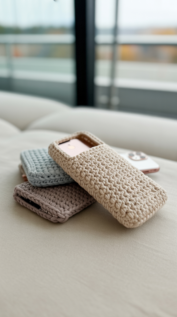 Eine Hülle aus weichem Garn schützt dein Telefon vor Kratzern. Dieses Modell passt sich flexibel an und trägt kaum auf. Ein einfacher Knopfverschluss hält das Gerät sicher.