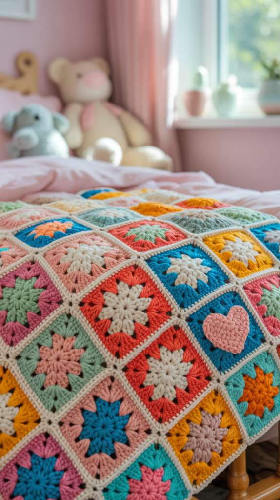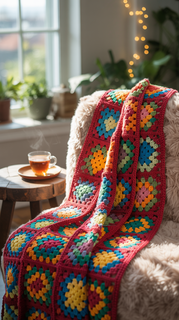 In dieser Idee baue ich ein Granny Square in ein größeres Granny Square ein. So entsteht ein spektakulärer Blickfang mit mehreren Ebenen. Die Technik wirkt aufwendig, ist aber erstaunlich einfach.