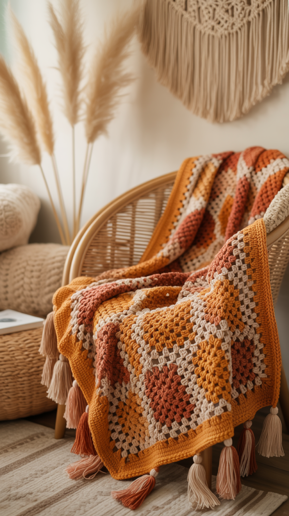 Diese Variante kombiniert Erdtöne mit knackigen Akzenten in Orange und Ocker. Die lebendigen Tupfen sorgen für den typischen Boho-Eindruck. Die Decke wirkt entspannt und doch ausdrucksstark.