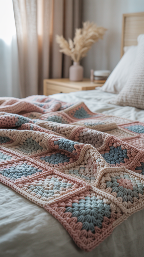 Das Zusammenfügen der Quadrate geschieht mit der Matratzenstich-Methode oder mit einer Runde fester Maschen. So bleibt die Decke flexibel und die Naht kaum sichtbar. Runden mit Stäbchen und halben Stäbchen bringen Struktur und Tiefe in das Gesamtbild.