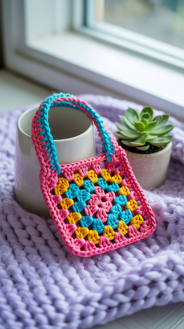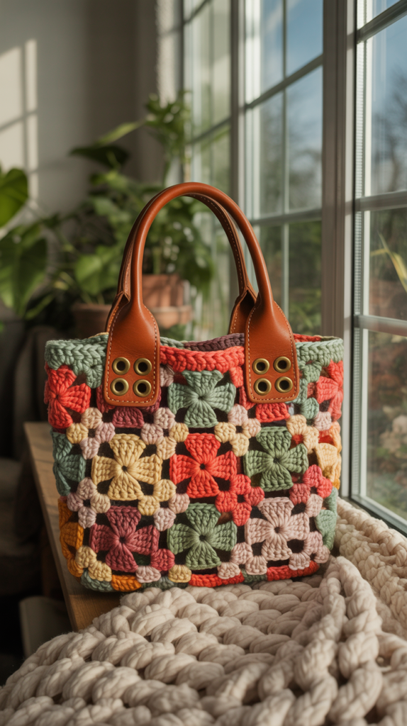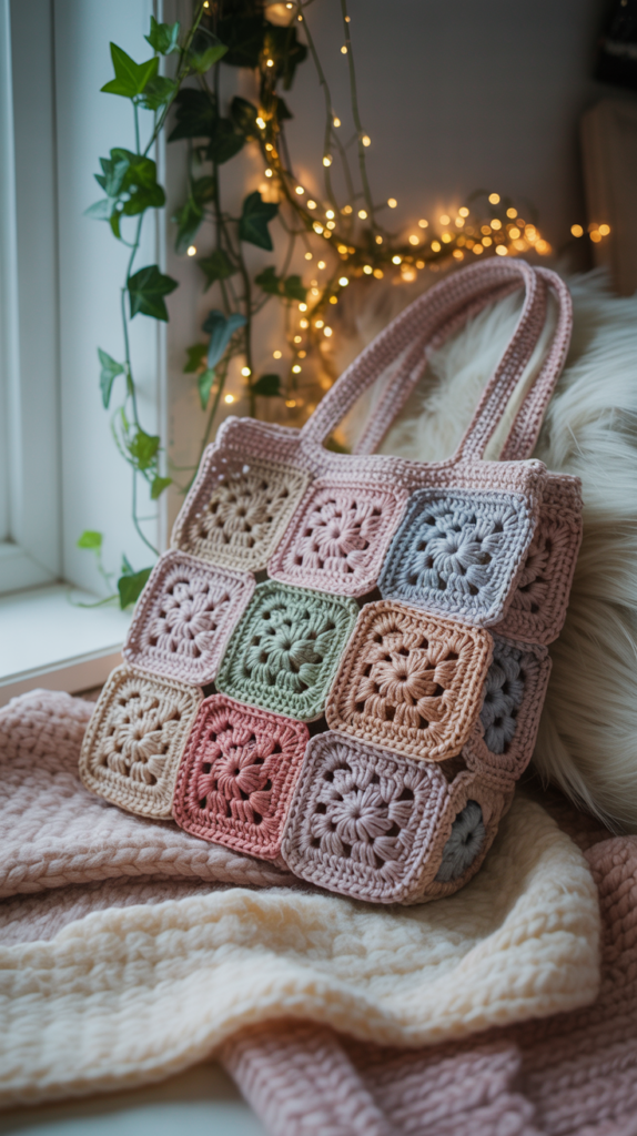 Diese Tasche wirkt zart und modern durch sanfte Farbnuancen. Du häkelst kleine Quadrate in unterschiedlichen Pastelltönen und verbindest sie zu einem weichen Farbverlauf. Sie passt gut zu leichter Kleidung.