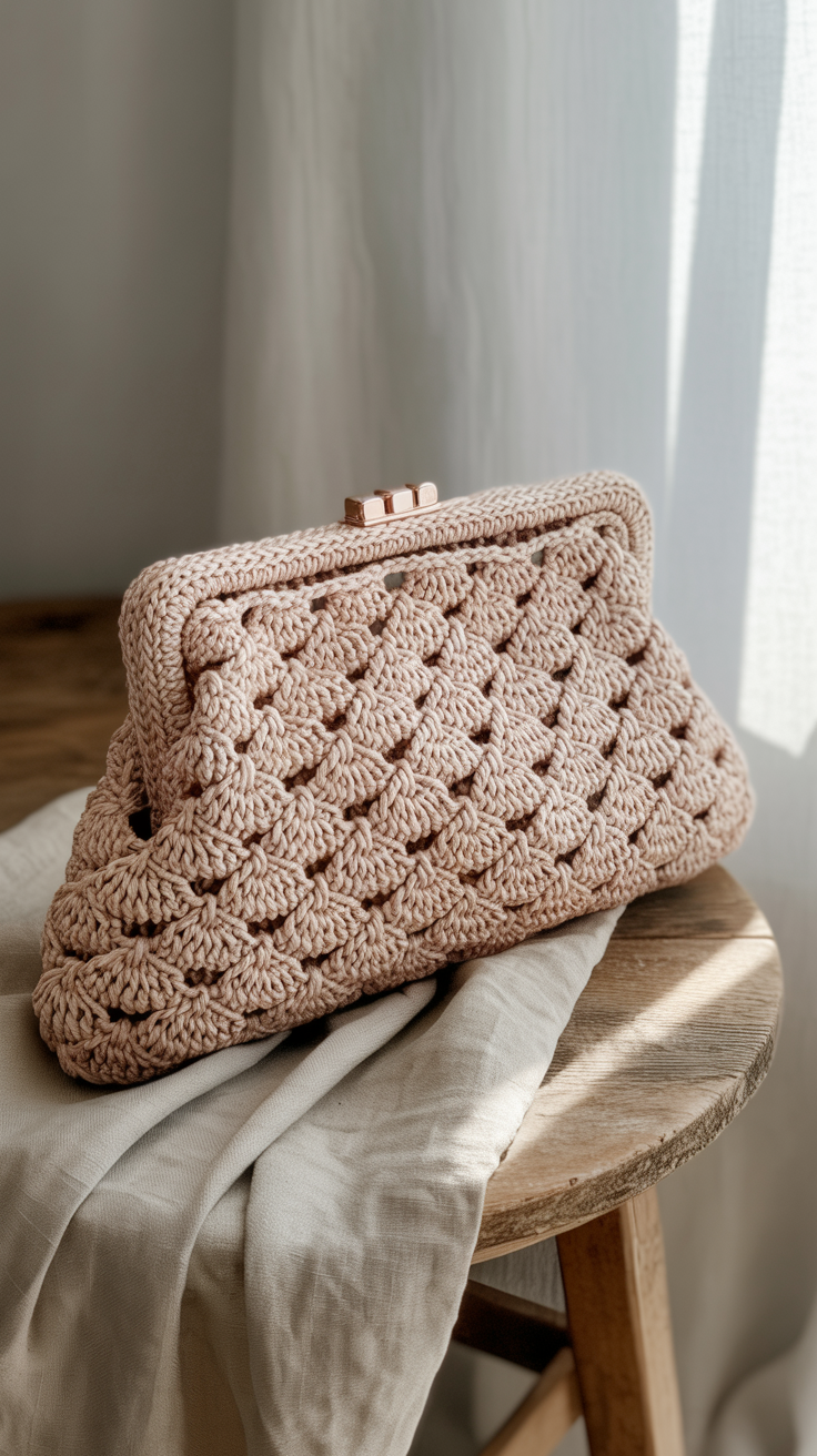 Die Clutch im Muschelmuster wirkt elegant und strukturiert. Sie eignet sich als Abendtasche oder besondere Geschenkidee. Ich häkle das Muschelmuster in abwechselnden Farben für einen feinen Effekt.