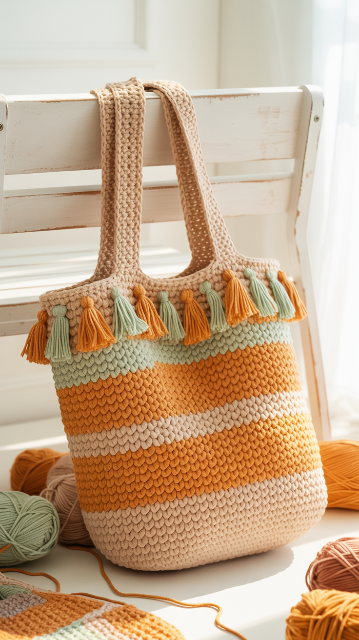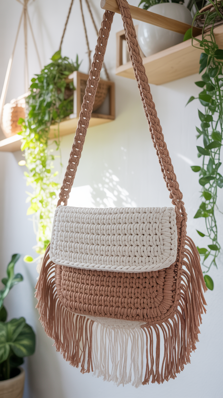 Eine Umhängetasche mit Fransen erhält sofort einen Boho-Touch. Die Fransen lockern das Design auf und vermitteln Leichtigkeit. Ich arbeite sie am unteren Rand entlang in gleicher Länge.