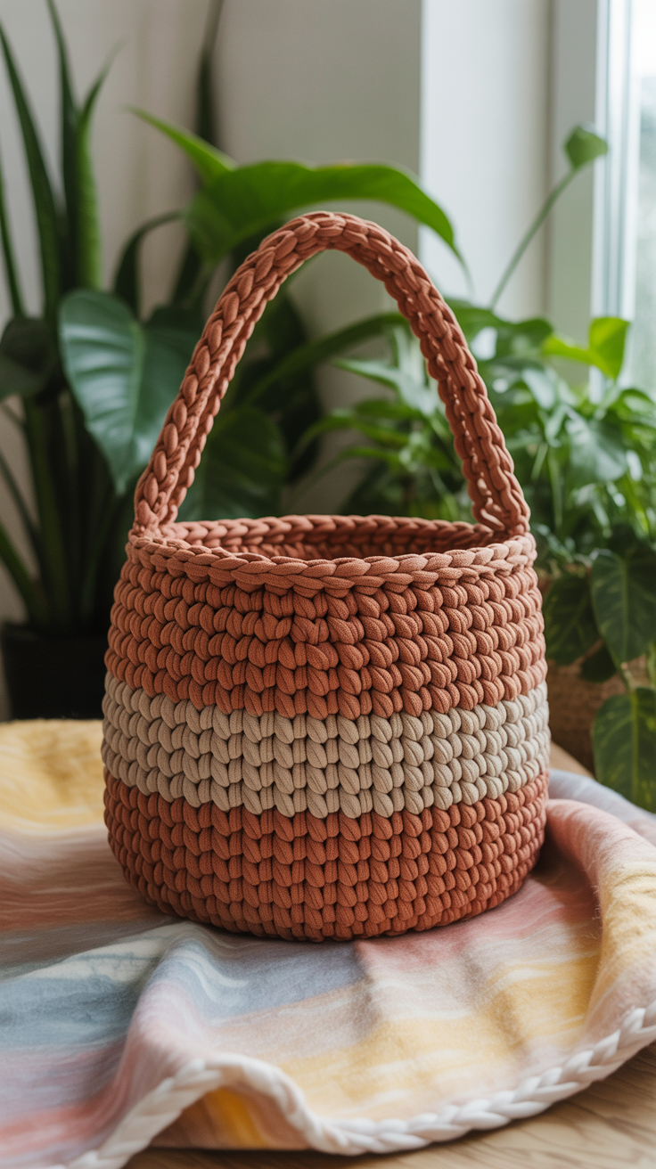 Diese korbartige Tasche ist ideal für Ausflüge ans Wasser. Sie trägt Spielzeug, Strandtuch und Getränke sicher. Ich häkle sie mit dicker Schnur um einen stabilen Stand zu gewährleisten.