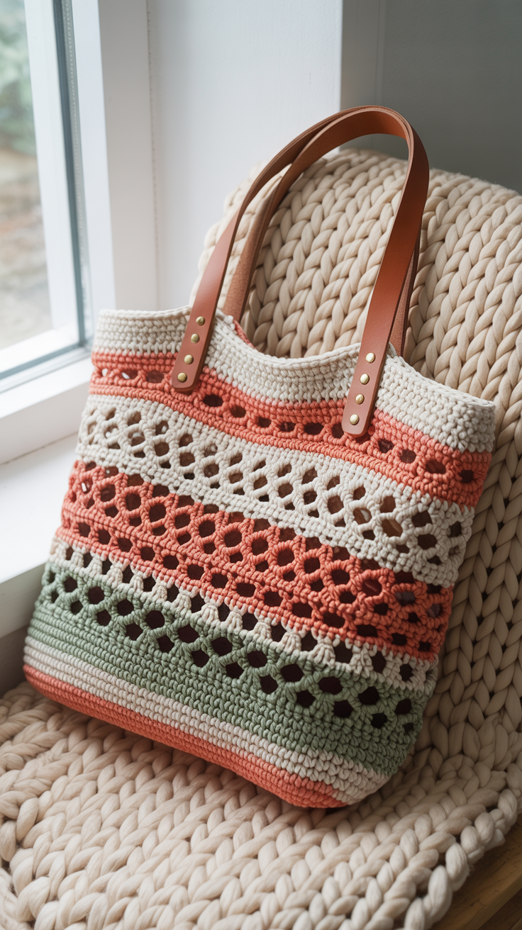Ein Lederhenkel macht das Design eleganter. Für den Alltag füge eine Innentasche mit Druckknopf ein. Das luftige Muster passt besonders gut im Sommer.