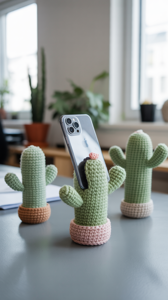 Ein stabiler Kaktus fungiert als Aufsteller für dein Smartphone. Die breite Basis sorgt für Halt. Du hast das Gerät im Blick und kannst Videos anschauen, während du häkelst.