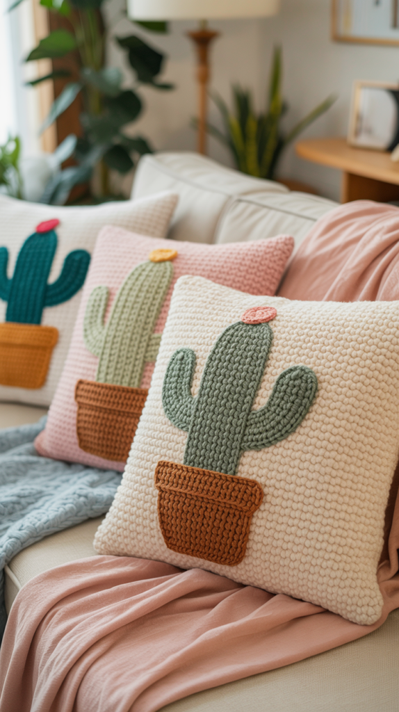Ein gehäkelter Kaktus auf einem Kissenbezug wirkt charmant und einzigartig. Als Hingucker dient die Applikation in frischen Farben. Das Kissen ist ein Geschenk für Pflanzenfans.