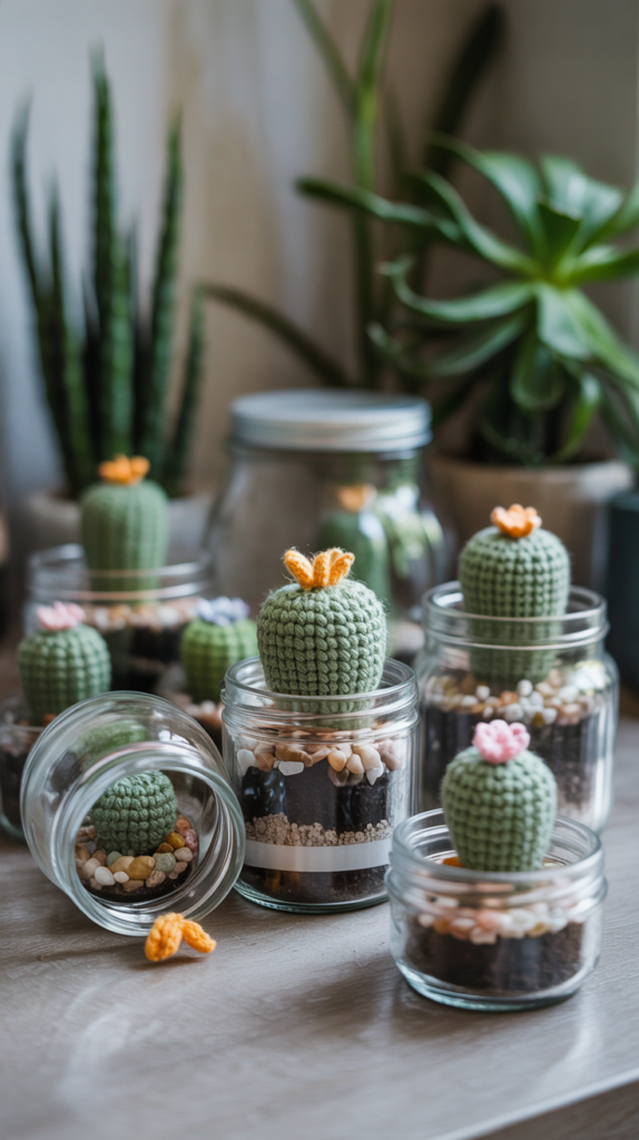 In einem kleinen Glasbehälter wirkt dein gehäkelter Kaktus wie in seinem natürlichen Lebensraum. Das verschließbare Glas schützt den Staubfänger und ist leicht zu reinigen.