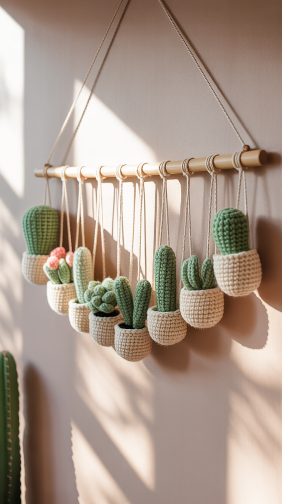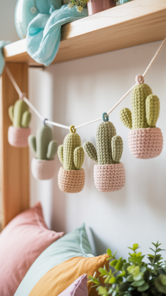 Du kannst zwischen den Kakteen kleine Pompons oder Perlen einfügen. So entsteht ein lebendiger Rhythmus. Wähle wechselnde Grüntöne für mehr Vielfalt.