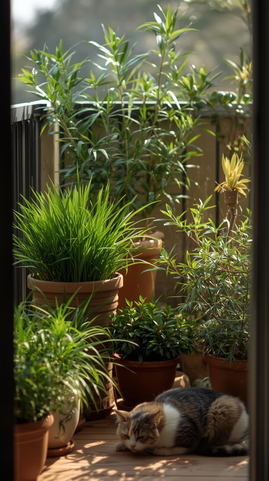 Ein Mini Garten bringt Leben auf den Balkon. Katzen lieben Düfte und frisches Grün. Sichere Pflanzen machen den Ort friedlich und schön.