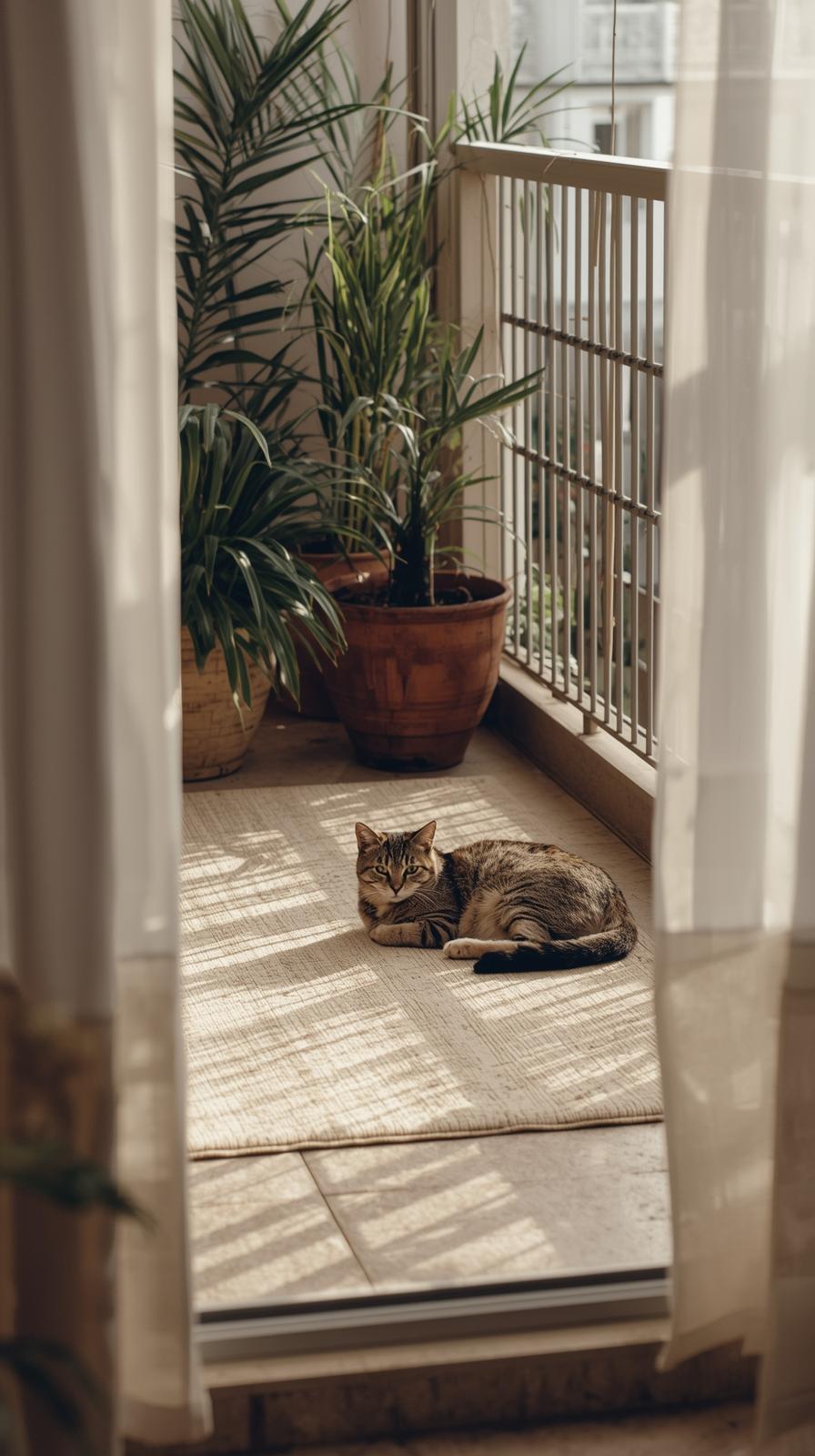Ein Teppich macht den Balkon weich. Deine Katze fühlt sich sofort wohler. Der Boden wirkt warm und einladend.