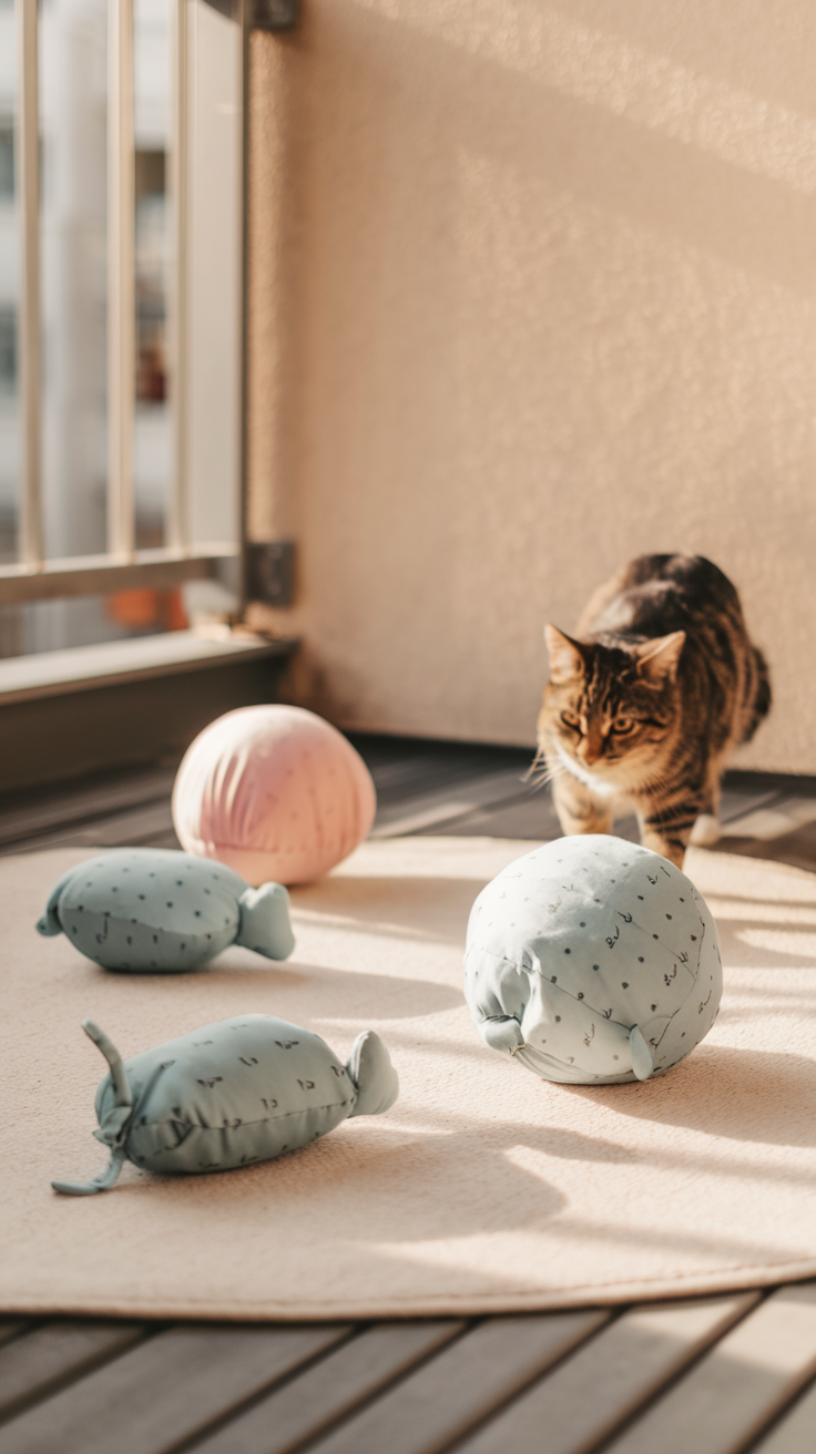Kleine Spiele sorgen für Spaß. Eine Ecke mit Bällen oder Stoffmäusen bringt Bewegung und Freude. Es fühlt sich an wie ein kleiner Spielplatz im Freien.