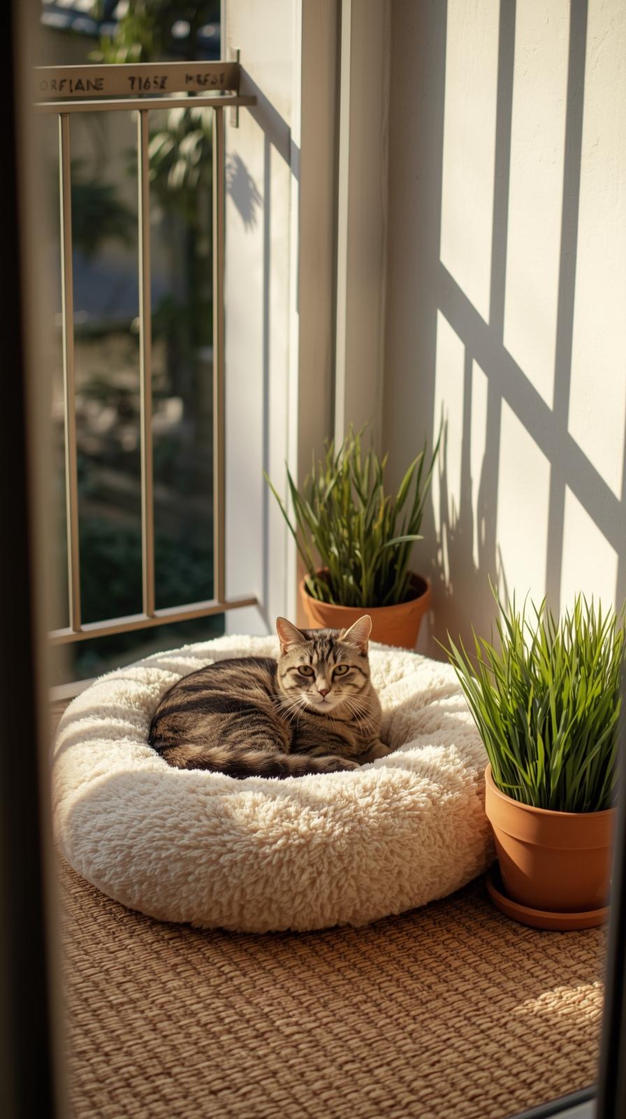 So richtest du diesen Platz ein. Wähle ein wetterfestes Kissen oder eine kleine Matte. Lege es an eine Stelle, die oft Sonne bekommt. Schau, wie deine Katze sich bewegt und passe den Platz an.