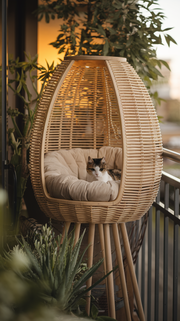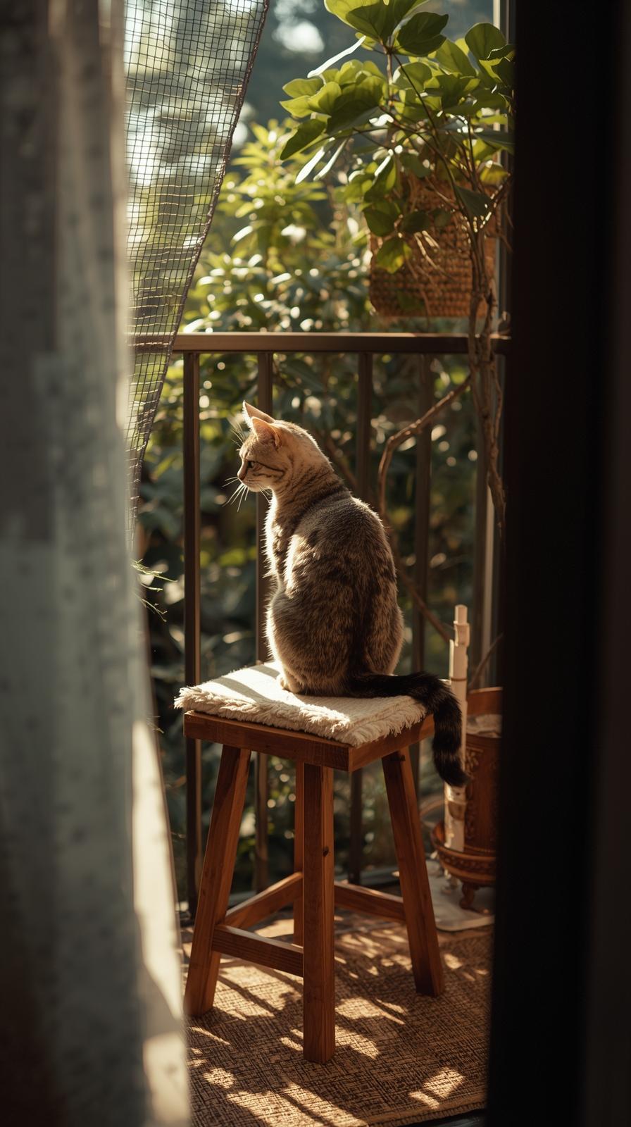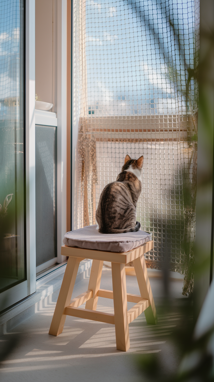 So richtest du diesen Bereich ein. Wähle etwas, das stabil steht. Holz fühlt sich warm an und passt gut auf jeden Balkon. Stelle den Platz so hin, dass deine Katze den Garten oder die Straße gut überblicken kann.