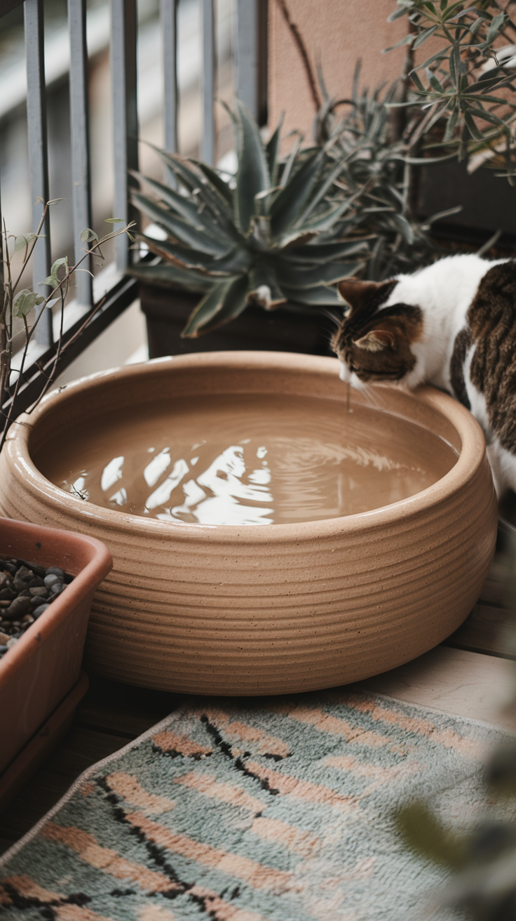 Wasser ist wichtig. Ein Trinkplatz macht den Balkon komplett. Katzen trinken öfter, wenn es draußen steht. Das tut dem Körper gut.