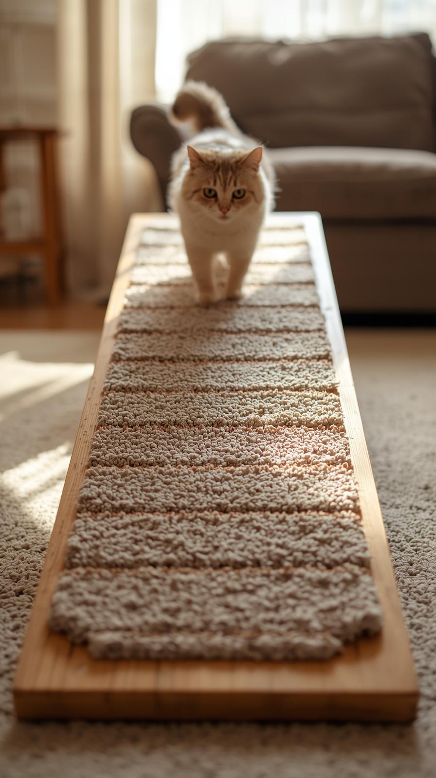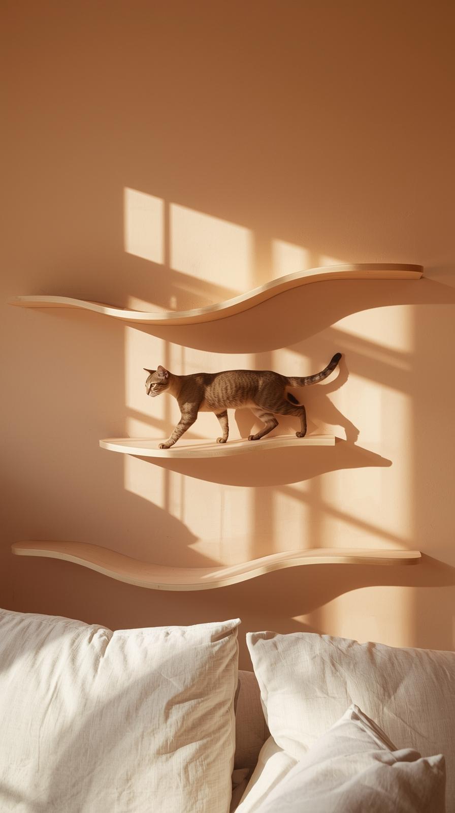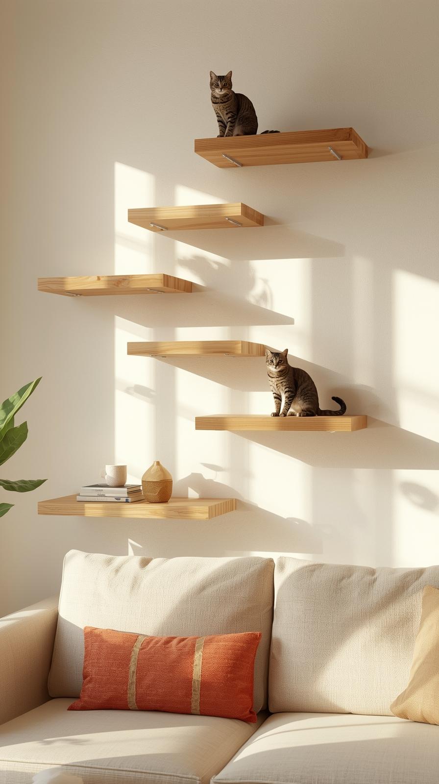Montiere flache Holzstege in einer sanften Linie. Ein leichter Bogen wirkt harmonisch. Lege rutschfeste Pads darauf. Deine Katze kann von Steg zu Steg springen und das Wohnzimmer aus neuer Perspektive sehen.