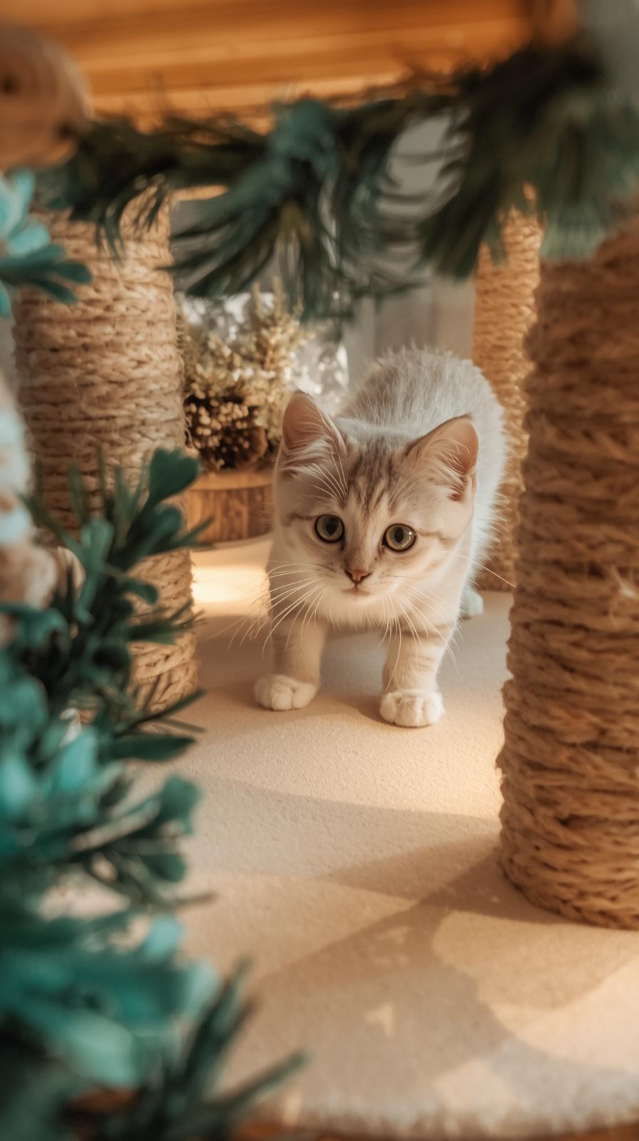 Nutze künstliche Blätter, Teppichreste oder kleine Holzstäbe. Baue eine leichte Spielstruktur mit mehreren Ebenen. Achte darauf dass keine Kleinteile lösbar sind. So entsteht ein sicherer Fantasieplatz für deine Katze.