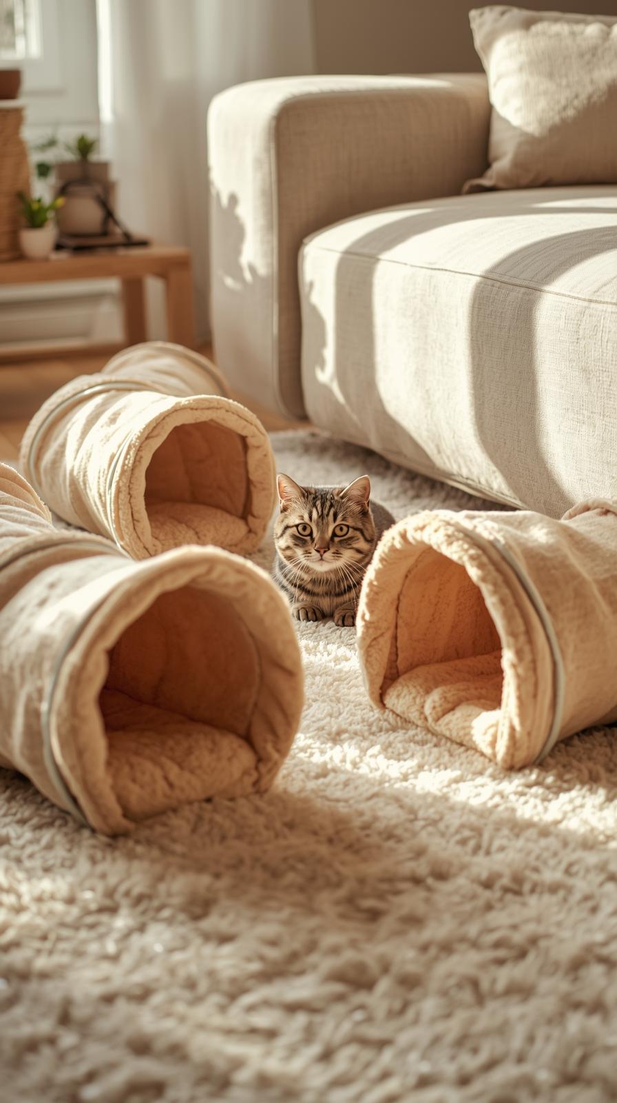 Platziere zwei oder drei Tunnel so dass kleine Wege entstehen. Verbinde sie mit Kissen oder Boxen. Deine Katze kann hindurchlaufen, springen oder sich verstecken.