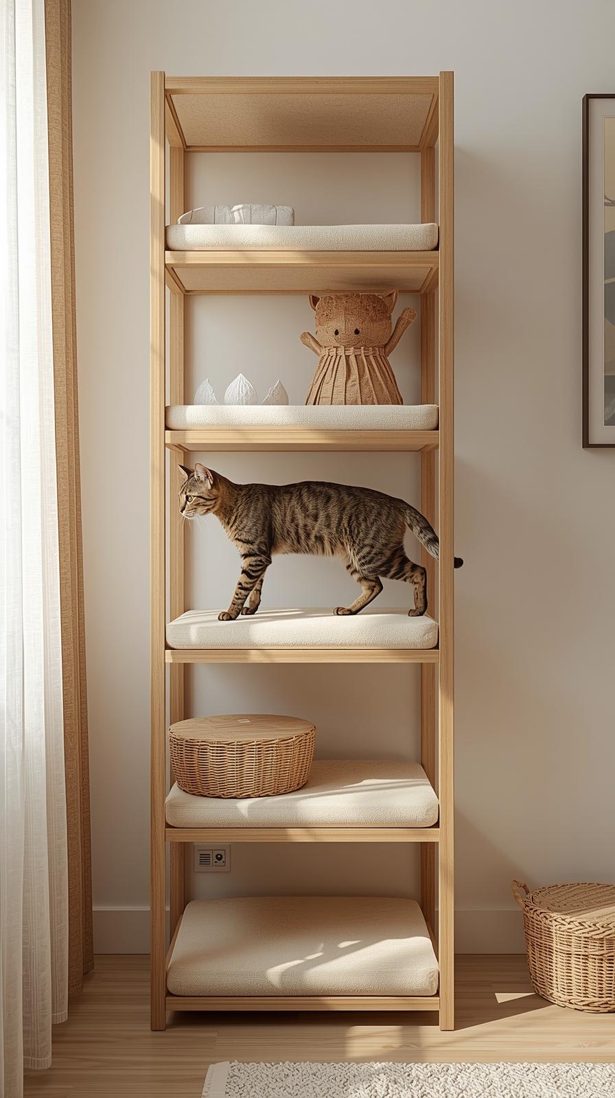 Räume ein schmales Regal frei und lege verschiedene Ebenen mit kleinen Auflagen aus. Integriere ein Kratzfeld oder eine Höhle. Kombiniere neutrale Farben damit es im Raum ruhig wirkt.