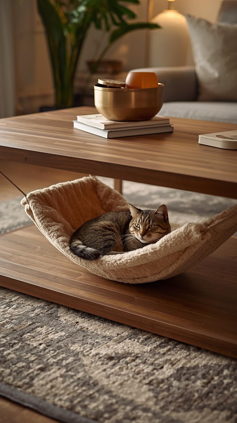 Eine Hängematte unter dem Couchtisch ist gemütlich und platzsparend. Katzen liegen gern geschützt und trotzdem mitten im Raum.