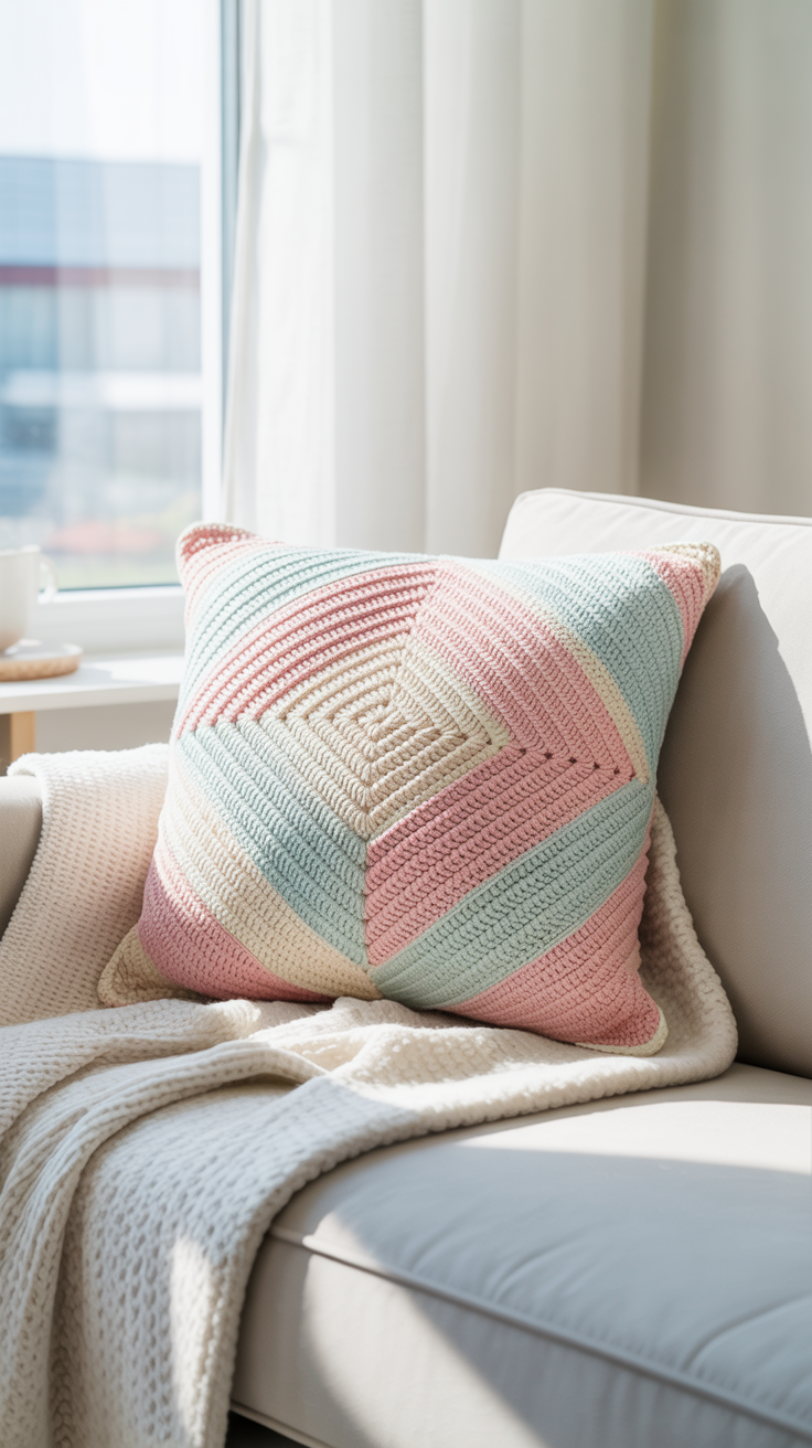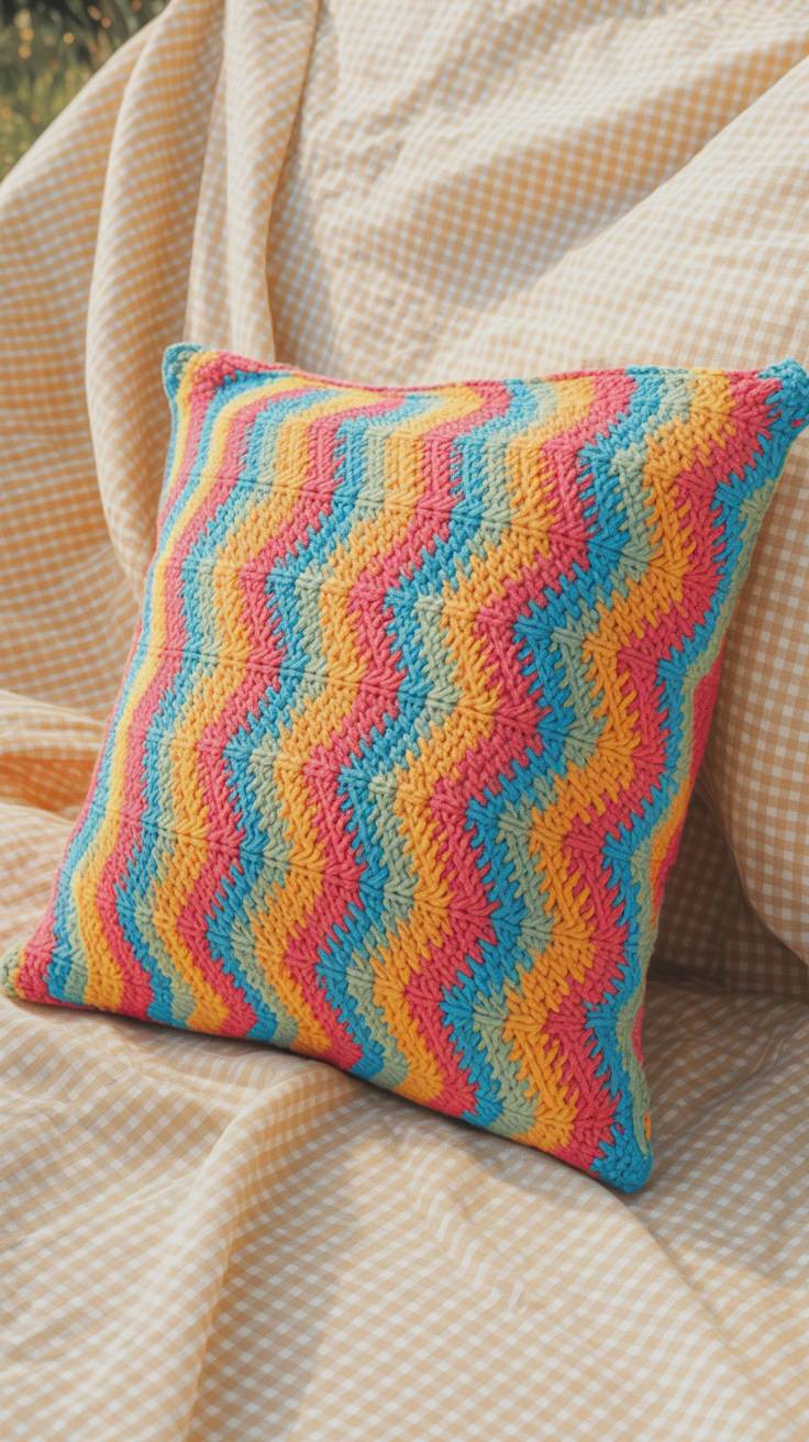 Ein Zickzack-Muster bringt Bewegung ins Design. Du häkelst in Dreiecken und wechselst die Richtung. Am Ende entsteht ein wellenartiges Kissen.