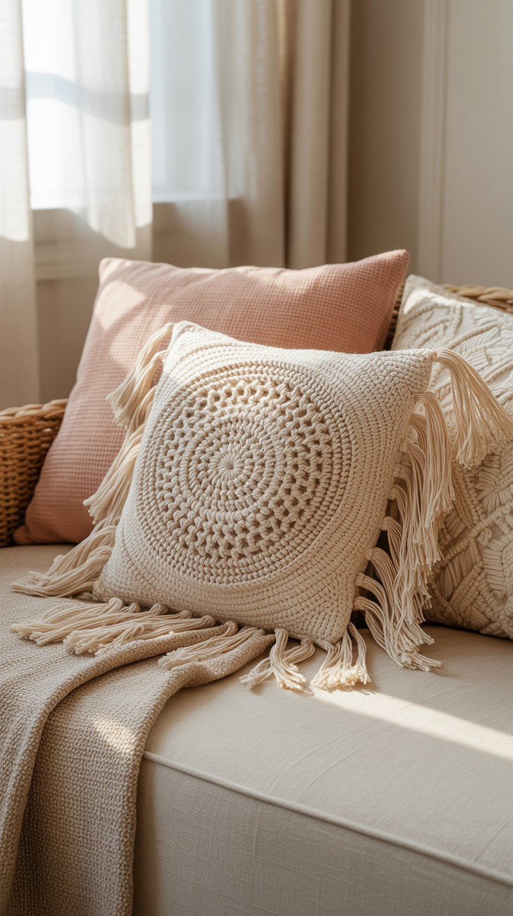 In Kombination von Makramee und Häkeln entsteht ein einzigartiges Kissen. Makramee-Knoten geben Struktur, Häkeln sorgt für Fülle. Das Ergebnis ist ein modernes Boho-Piece.